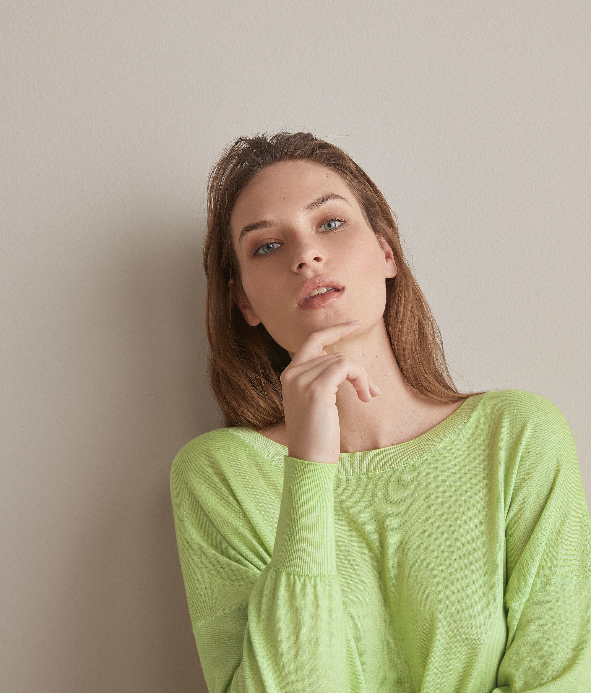 A sophisticated combination of the classic and the contemporary runs through the entire Falconeri collection. The choice of iconic yarns, such as the pure 50/2 cashmere, and balanced shapes and volumes perfectly demonstrates the brand's passion for fine materials and attention to detail. This boat-neck jumper with wide sleeves creates fluid, spontaneous lines and gives off a fresh, dynamic feel. The hem and the sleeves of this piece are defined by ribbed edging and the shoulders are slightly dropped. The specific "garment-dyed" colouring affords the piece a worn look and a soft hand. Model is 179 cm tall and wears a size M Chest: 88cm / Waist: 67cm / Hips: 94cm