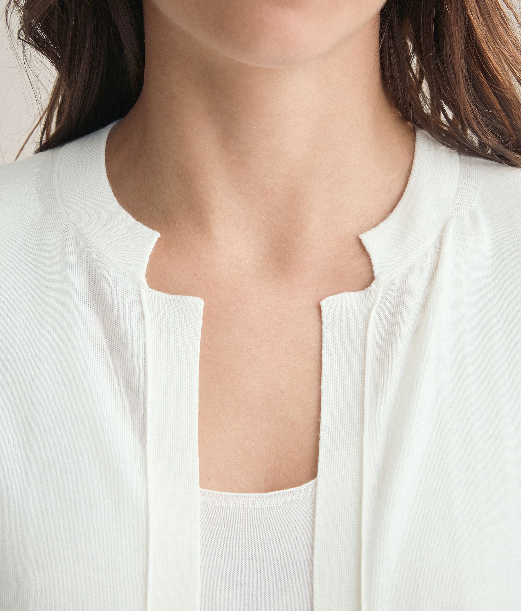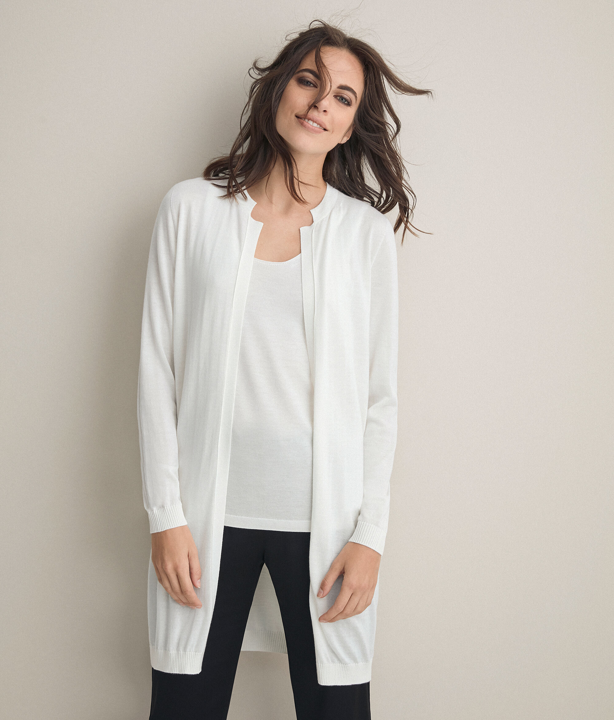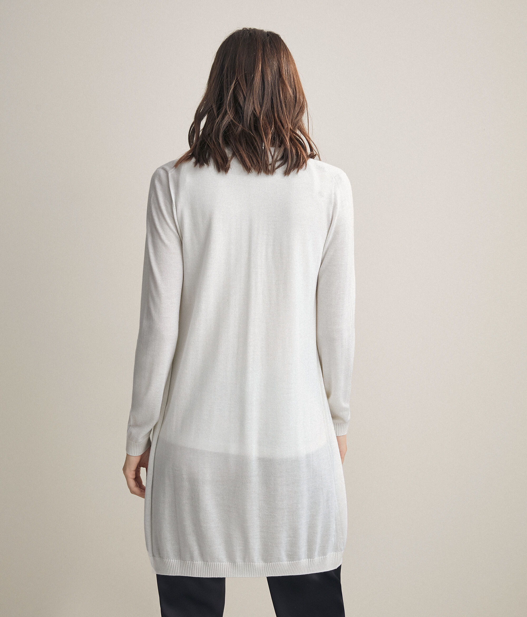 Maxi open cardigan with rever cut crew neck in lightweight cashmere. Model is 179 cm tall and wears a size MChest: 88cm / Waist: 67cm / Hips: 94cm