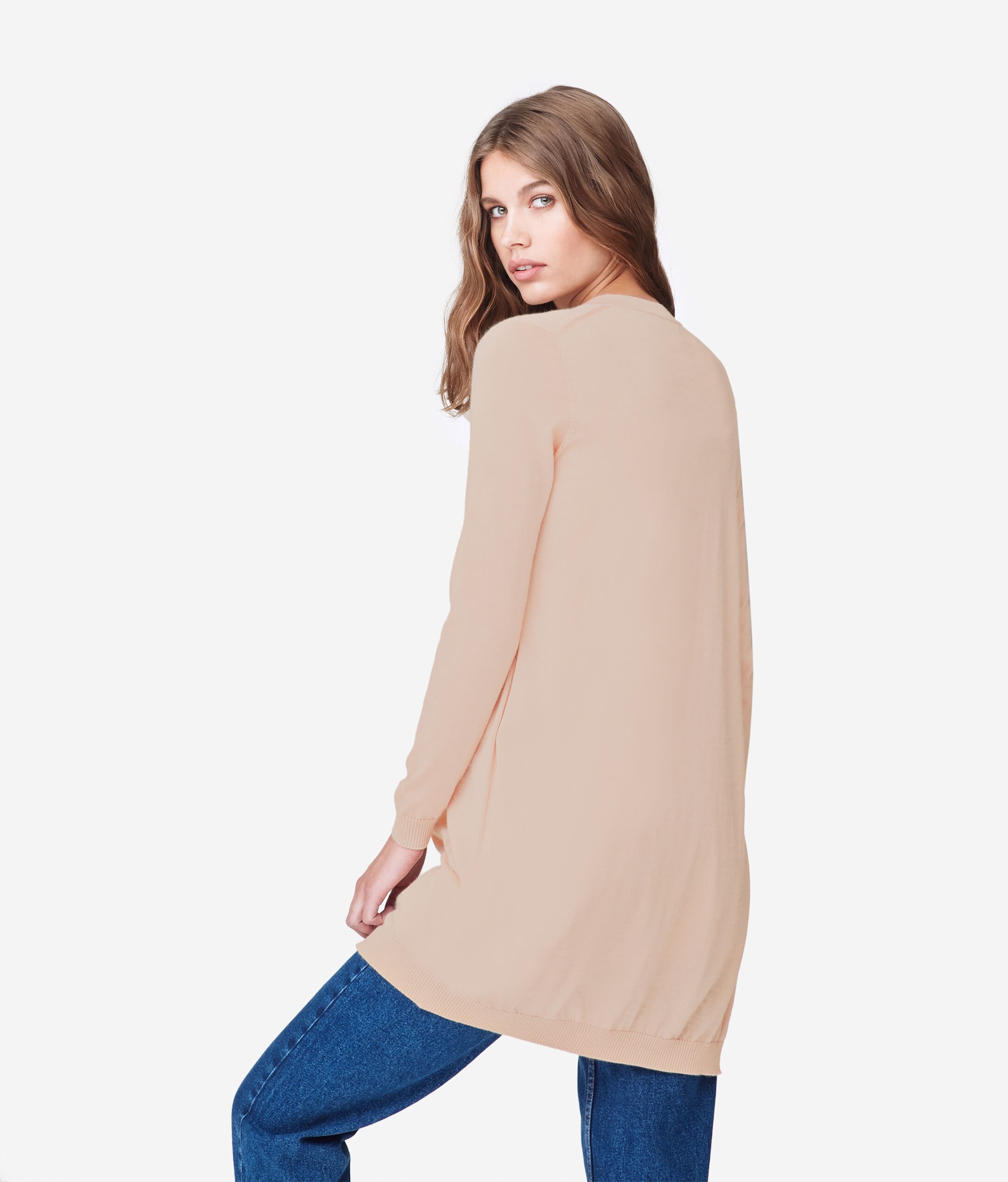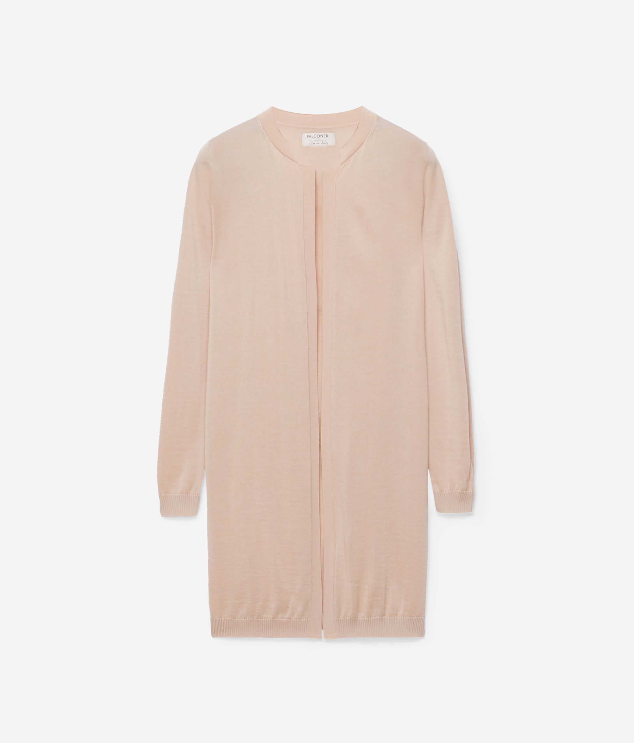 Maxi open cardigan with rever cut crew neck in lightweight cashmere. Model is 179 cm tall and wears a size MChest: 88cm / Waist: 67cm / Hips: 94cm