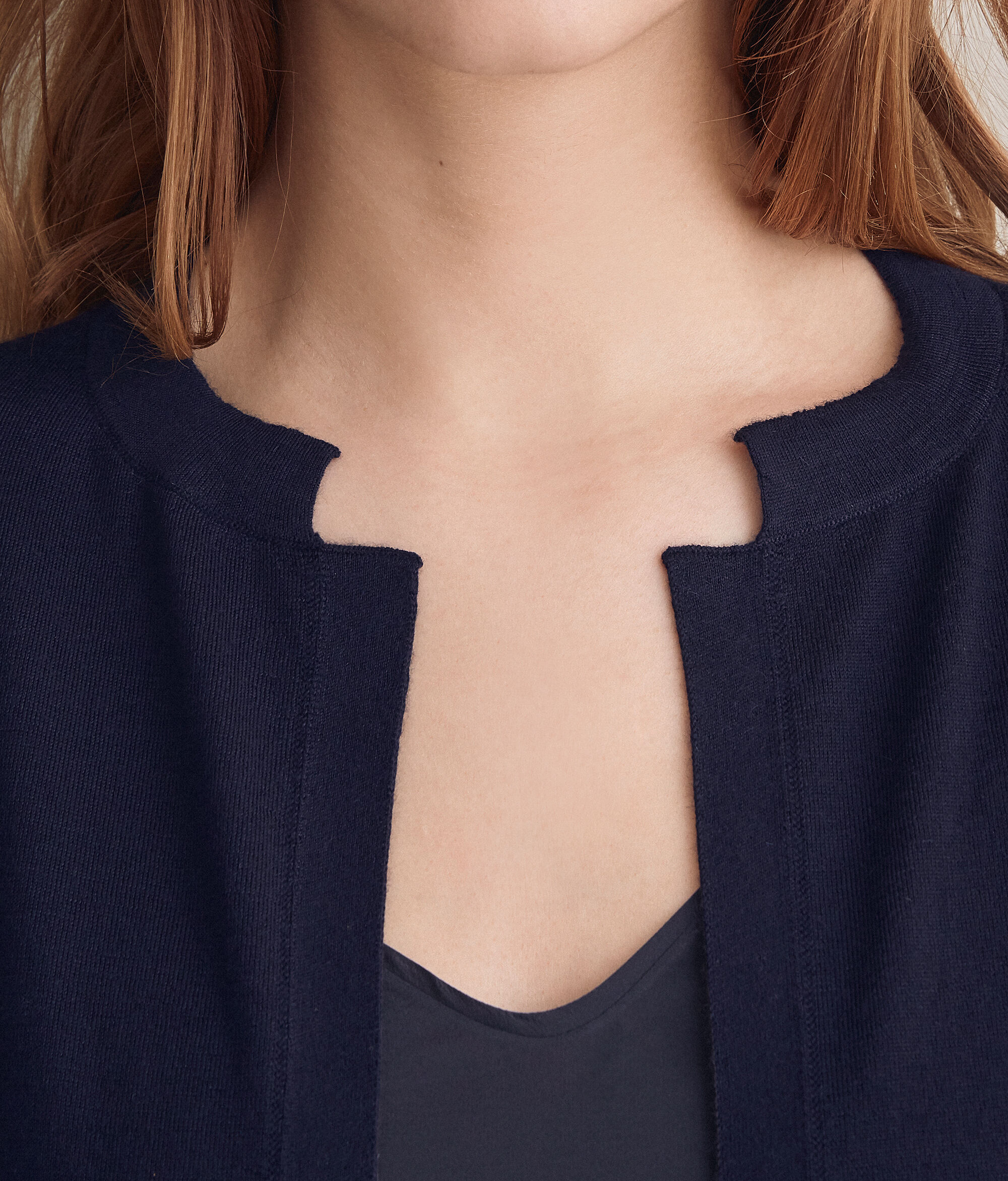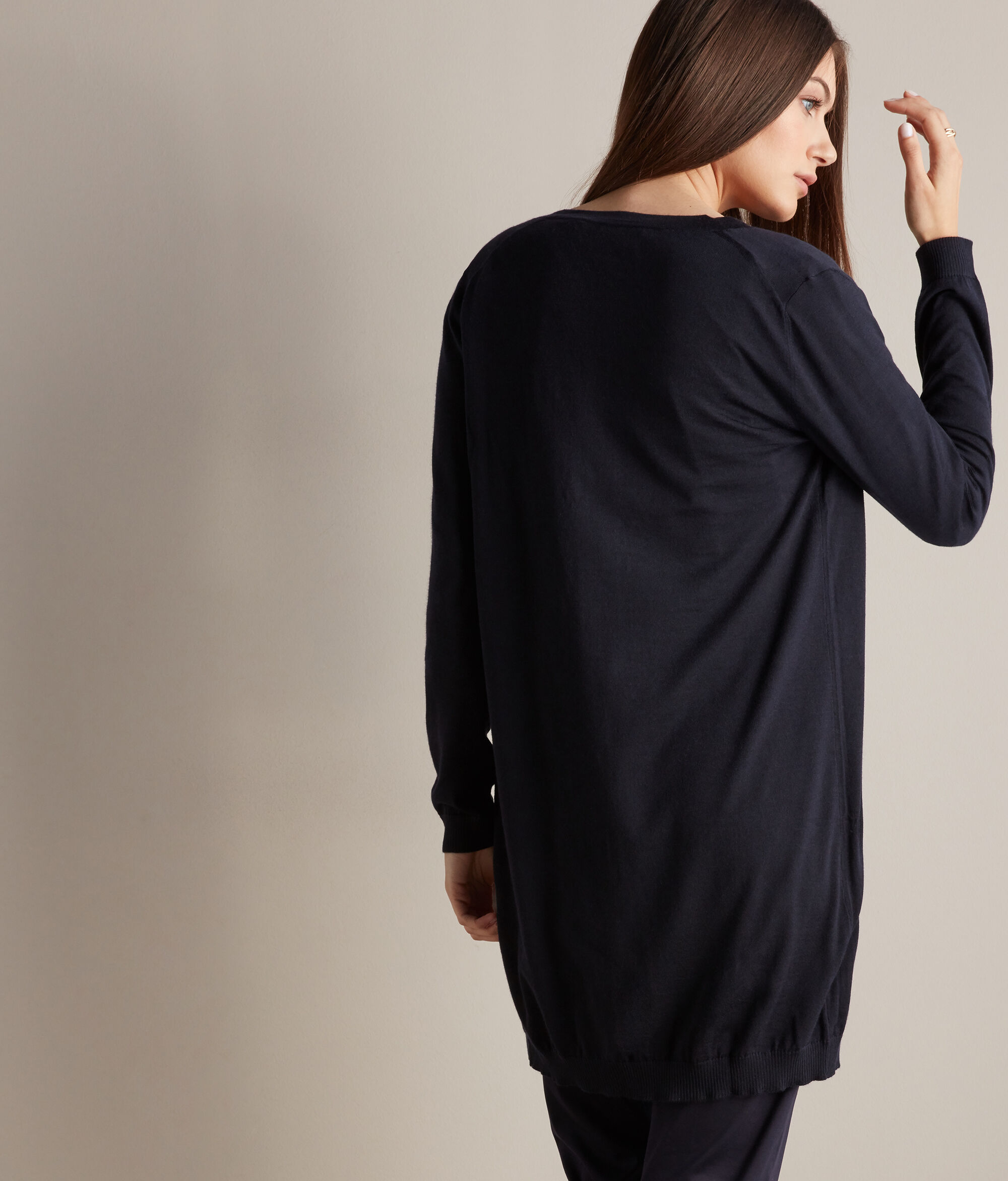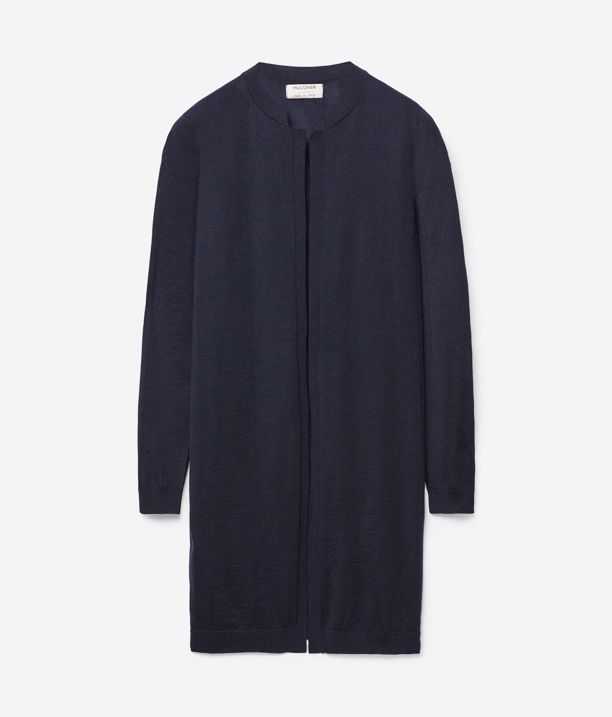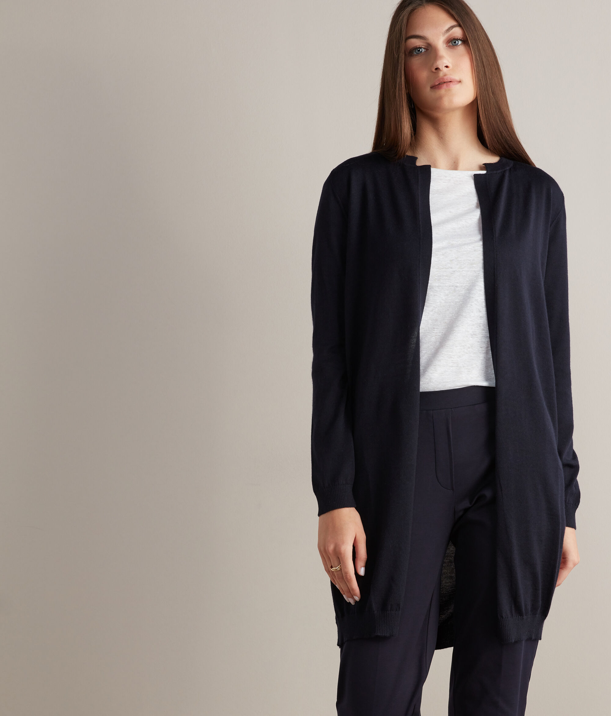 Maxi open cardigan with rever cut crew neck in lightweight cashmere. Model is 179 cm tall and wears a size MChest: 88cm / Waist: 67cm / Hips: 94cm