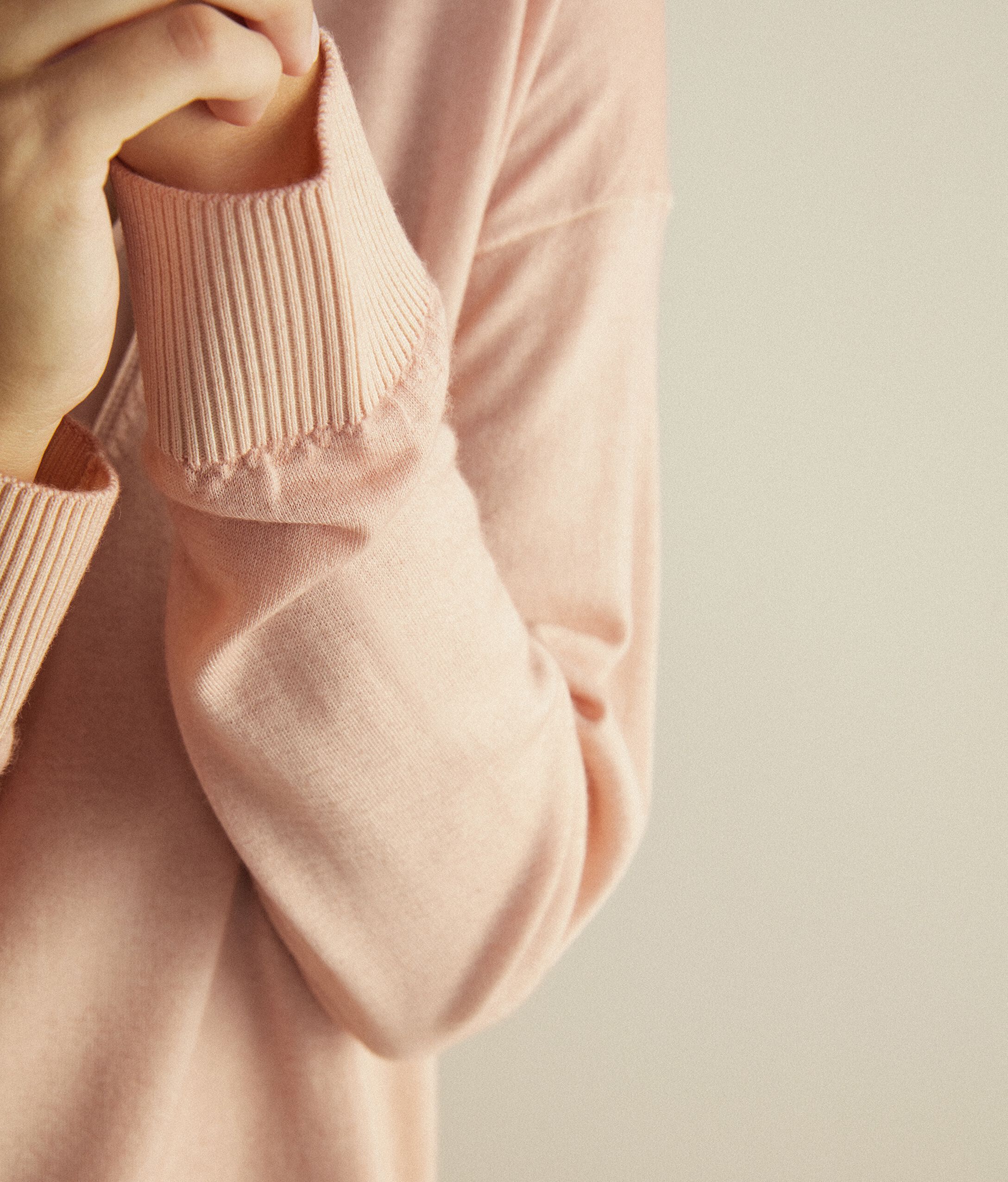 Maxi sweater with deep V neckline made entirely of Ultrafine Cashmere. Features dropped shoulders and ribbed trim at cuffs and hem. Relaxed fit. Model is 179 cm and wears a size M Chest: 88 cm / Waist: 67 cm / Hips: 94 cm