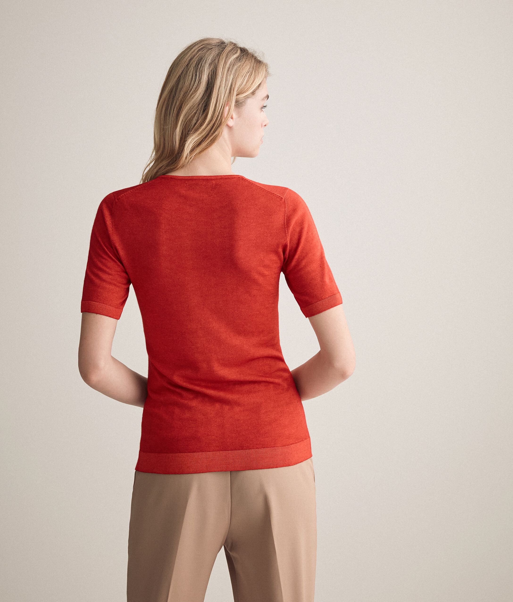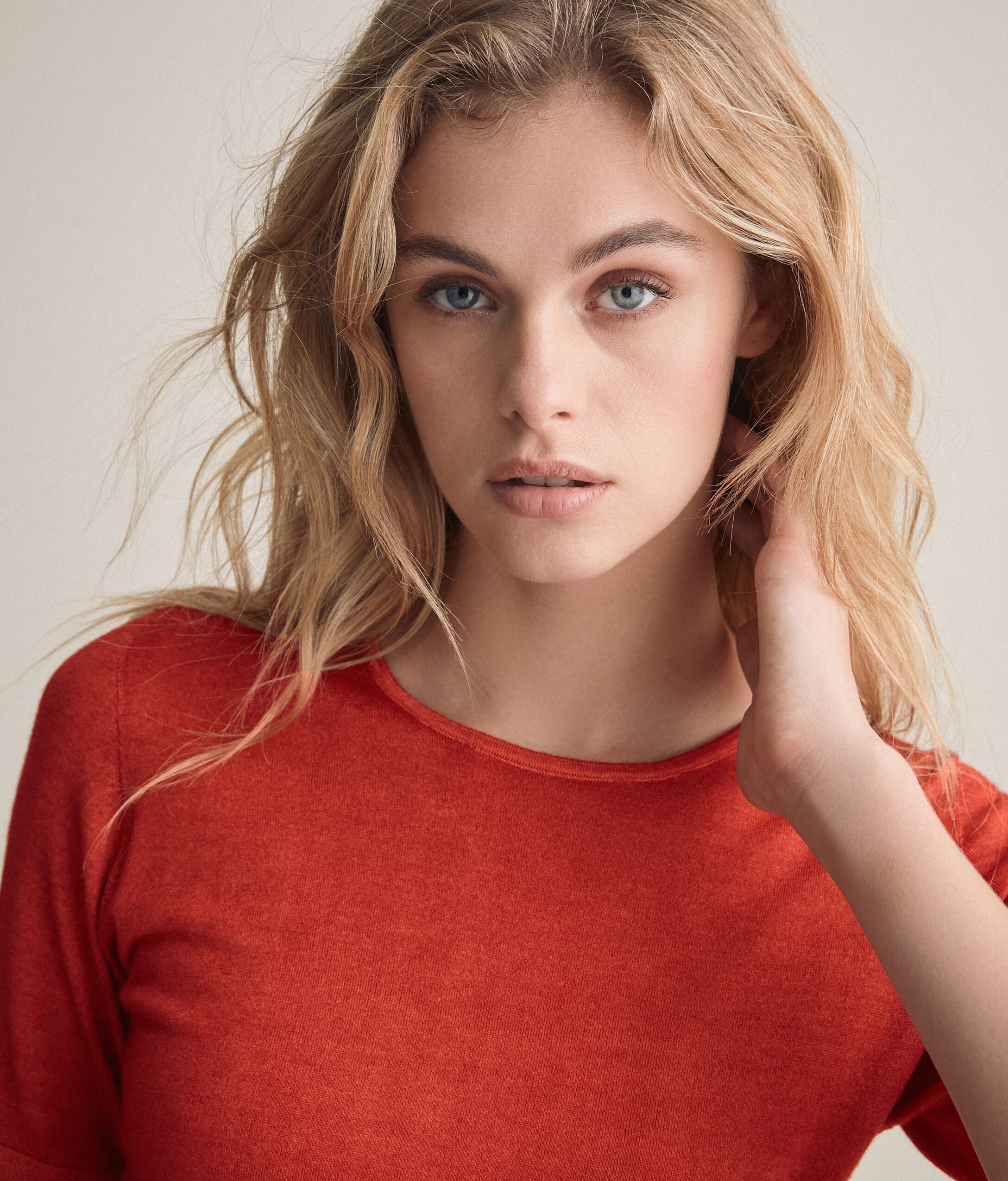 Short-sleeve crewneck sweater in seamless 100% Ultrafine Cashmere. Regular fit. Model is 179 cm and wears a size M Chest: 88 cm / Waist: 67 cm / Hips: 94 cm
