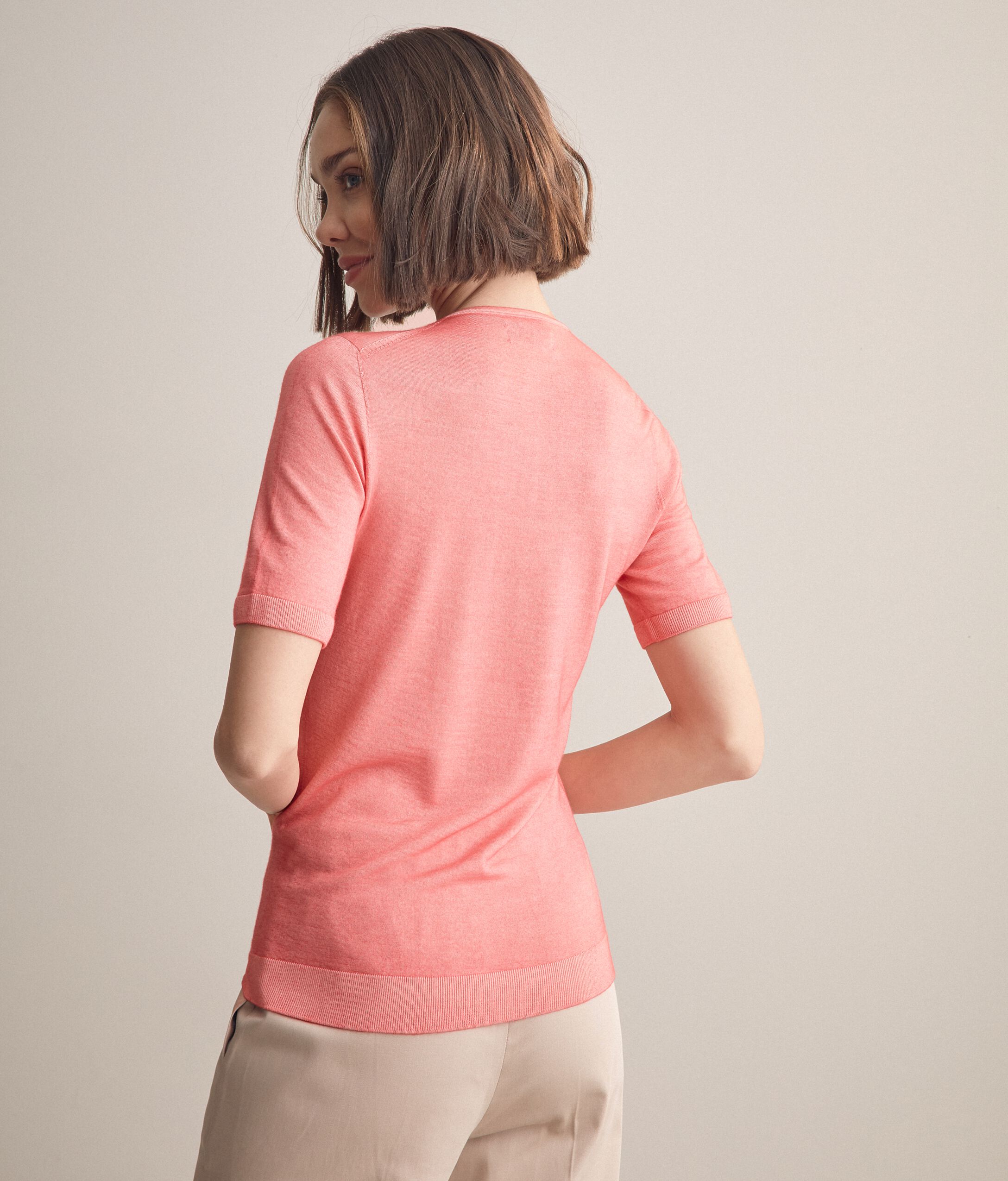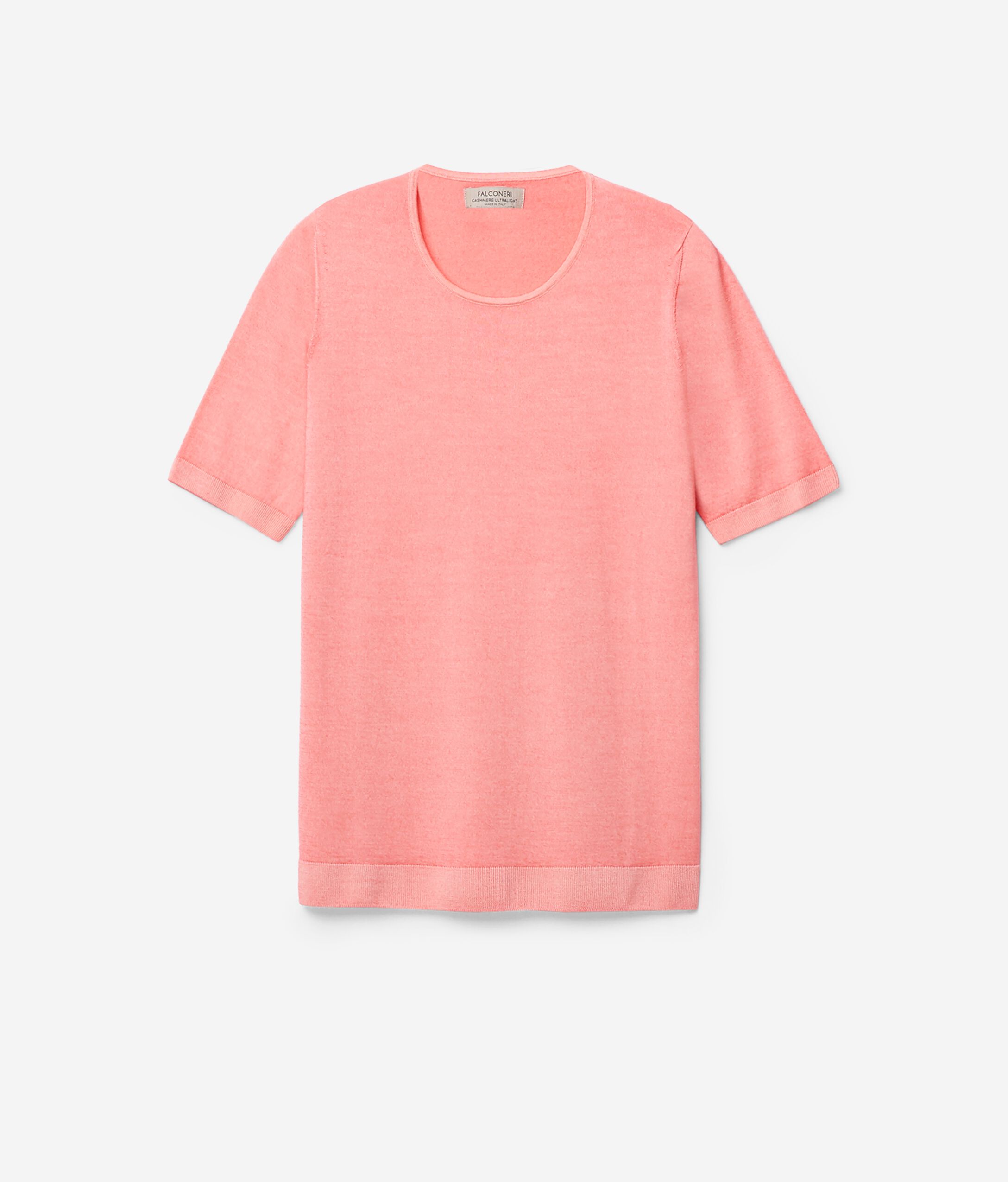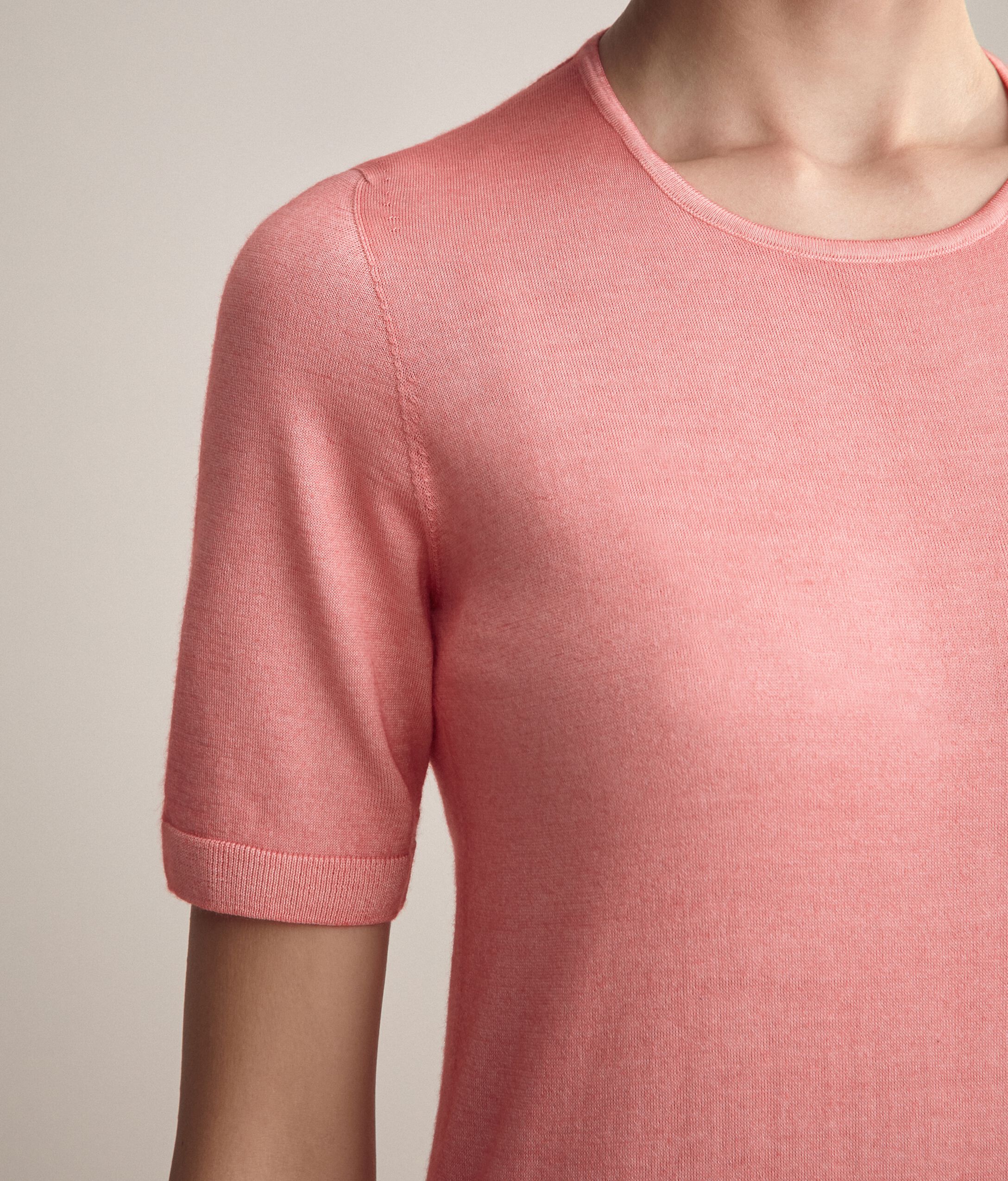 Short-sleeve crewneck sweater in seamless 100% Ultrafine Cashmere. Regular fit. Model is 179 cm and wears a size M Chest: 88 cm / Waist: 67 cm / Hips: 94 cm