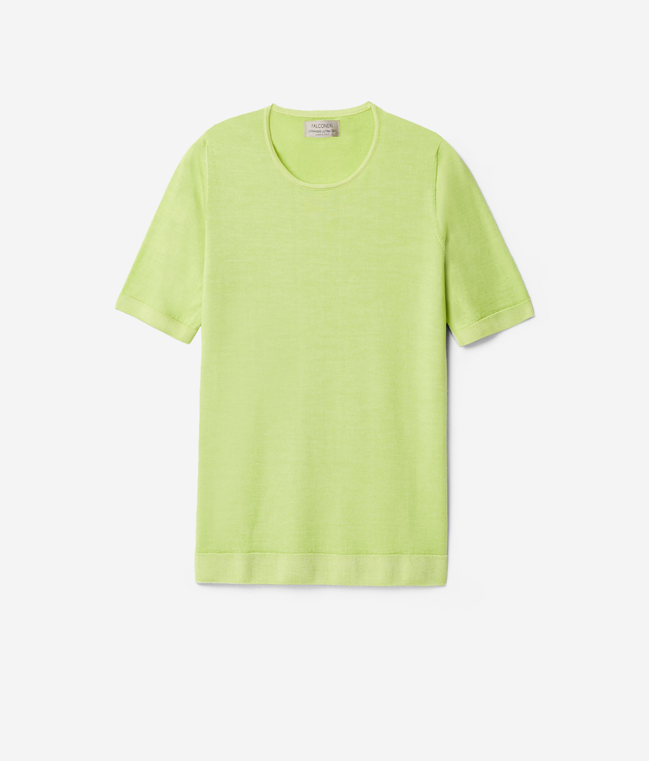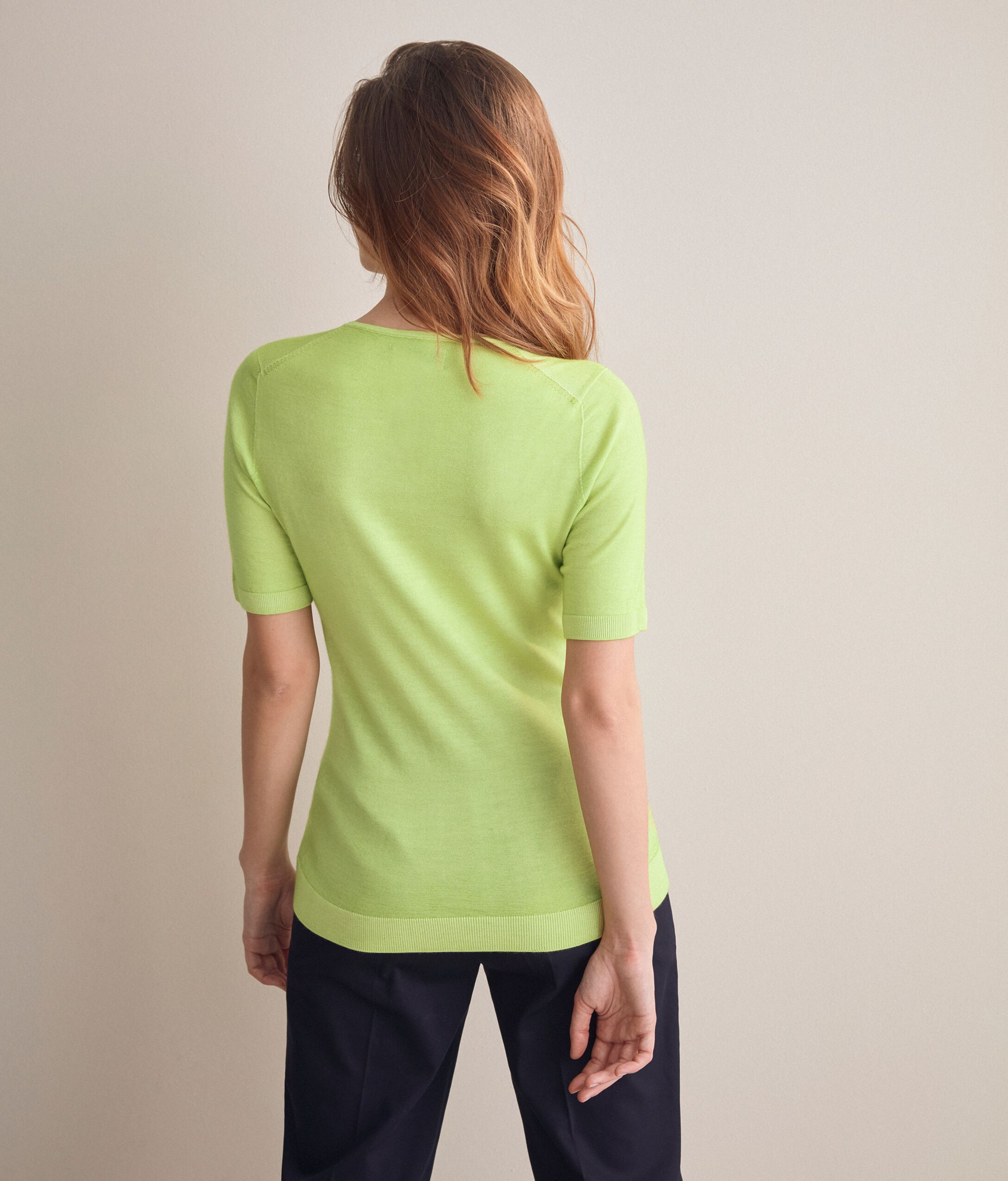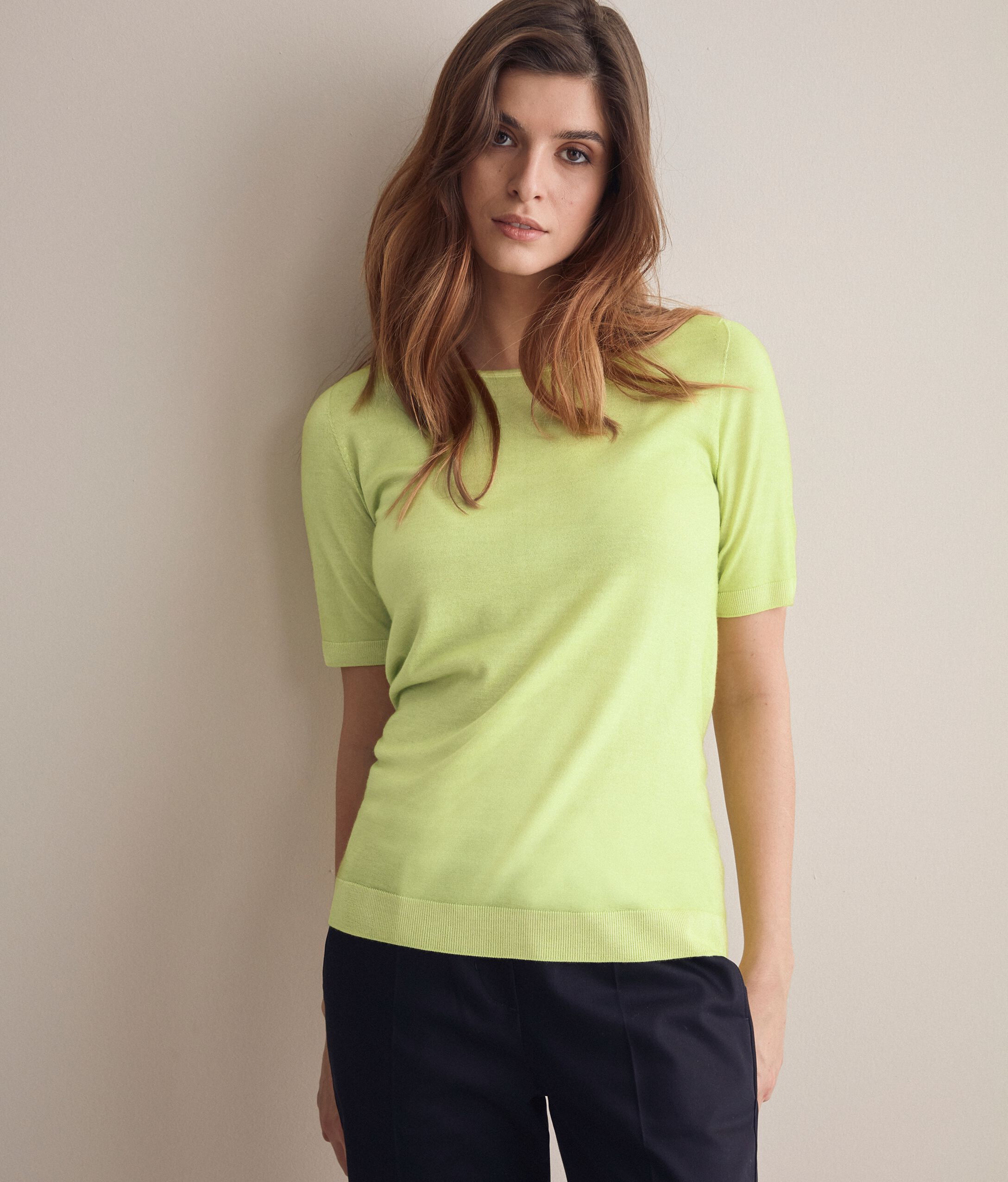 Short-sleeve crewneck sweater in seamless 100% Ultrafine Cashmere. Regular fit. Model is 179 cm and wears a size M Chest: 88 cm / Waist: 67 cm / Hips: 94 cm
