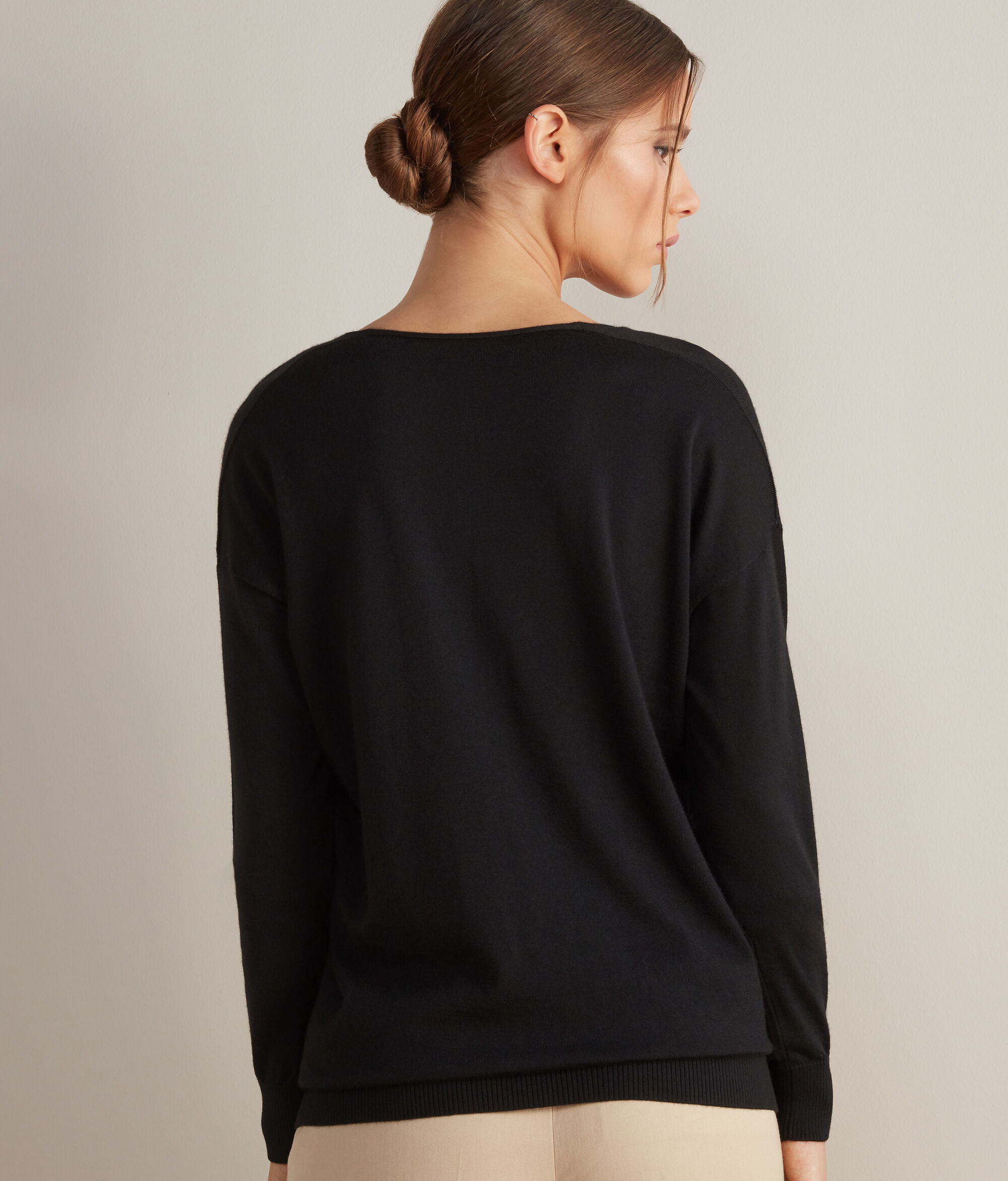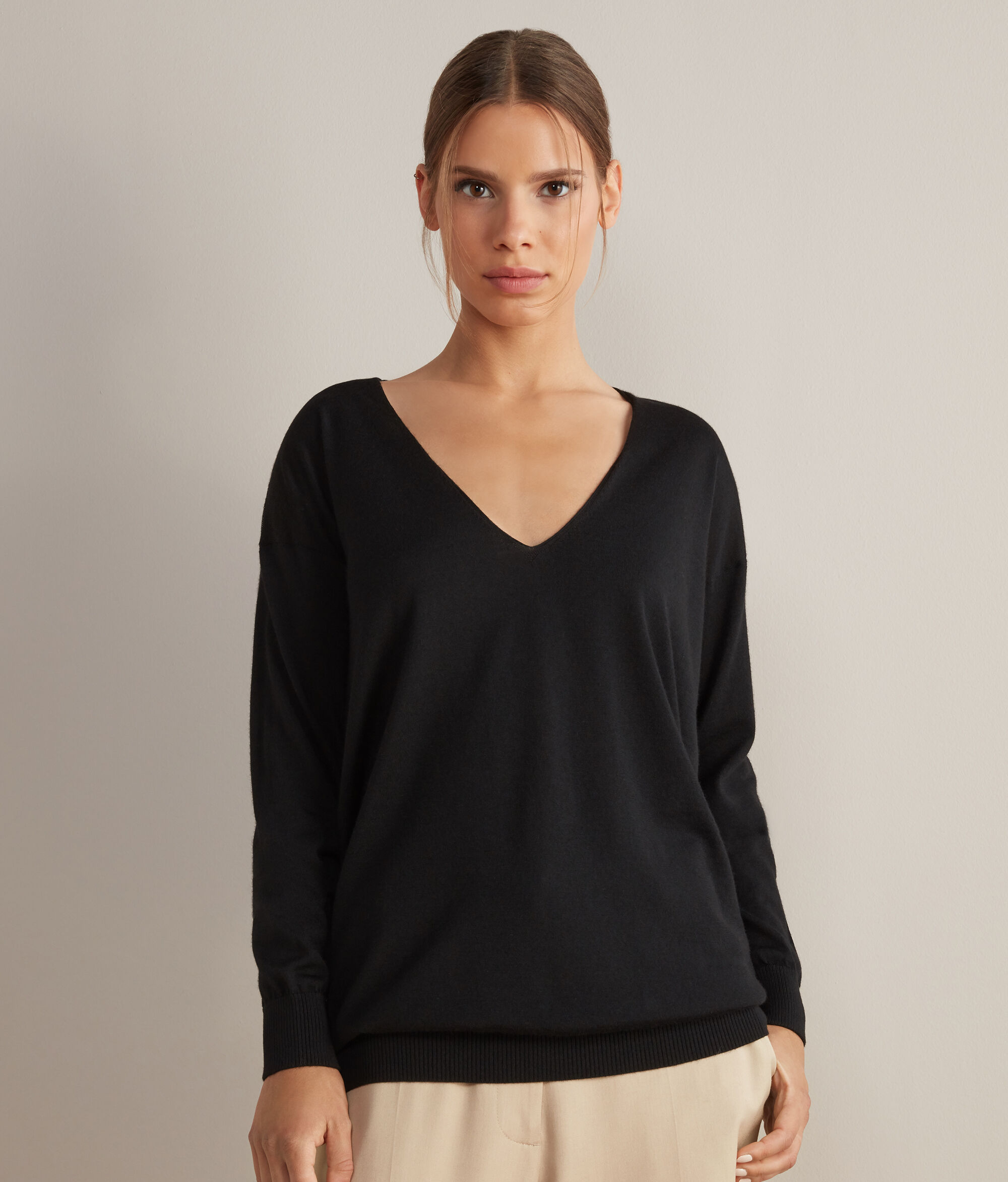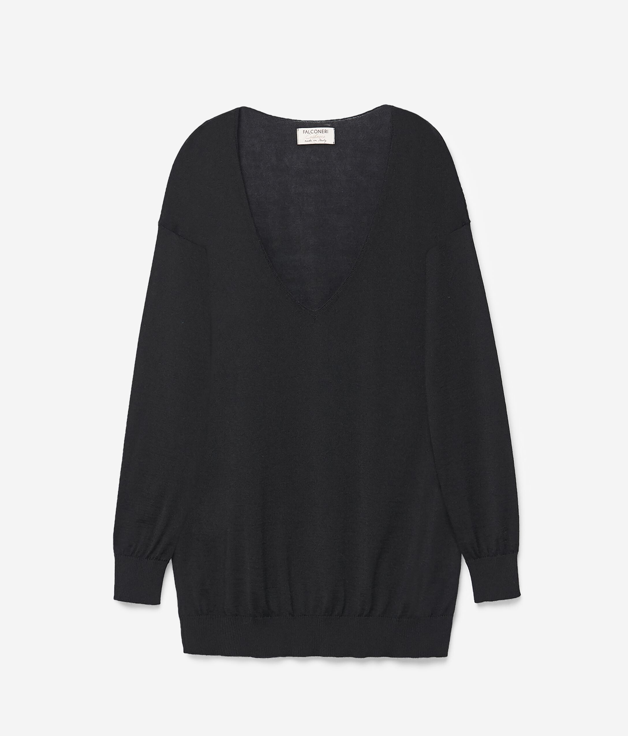Maxi sweater made of cashmere with a deep V neckline and dropped shoulders. Ribbed trim featured at hem and cuffs. Relaxed fit. Model is 179 cm and is wearing size M Chest: 88 cm / Waist: 67 cm / Hips: 94 cm