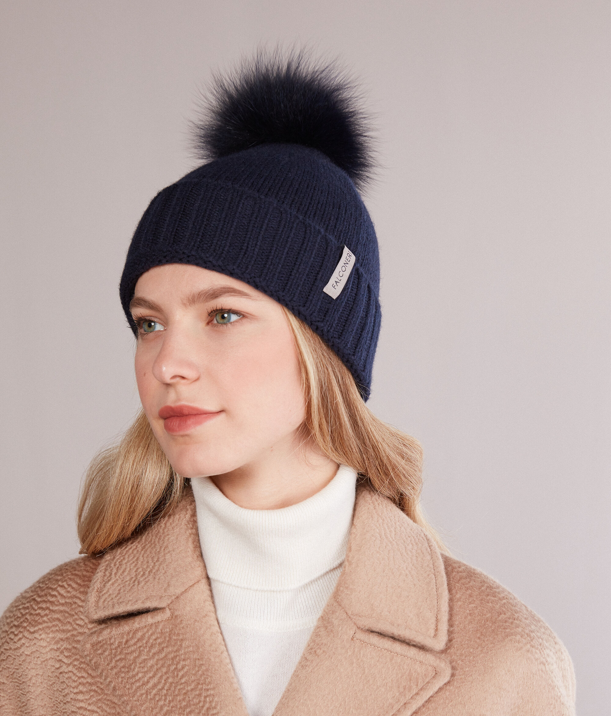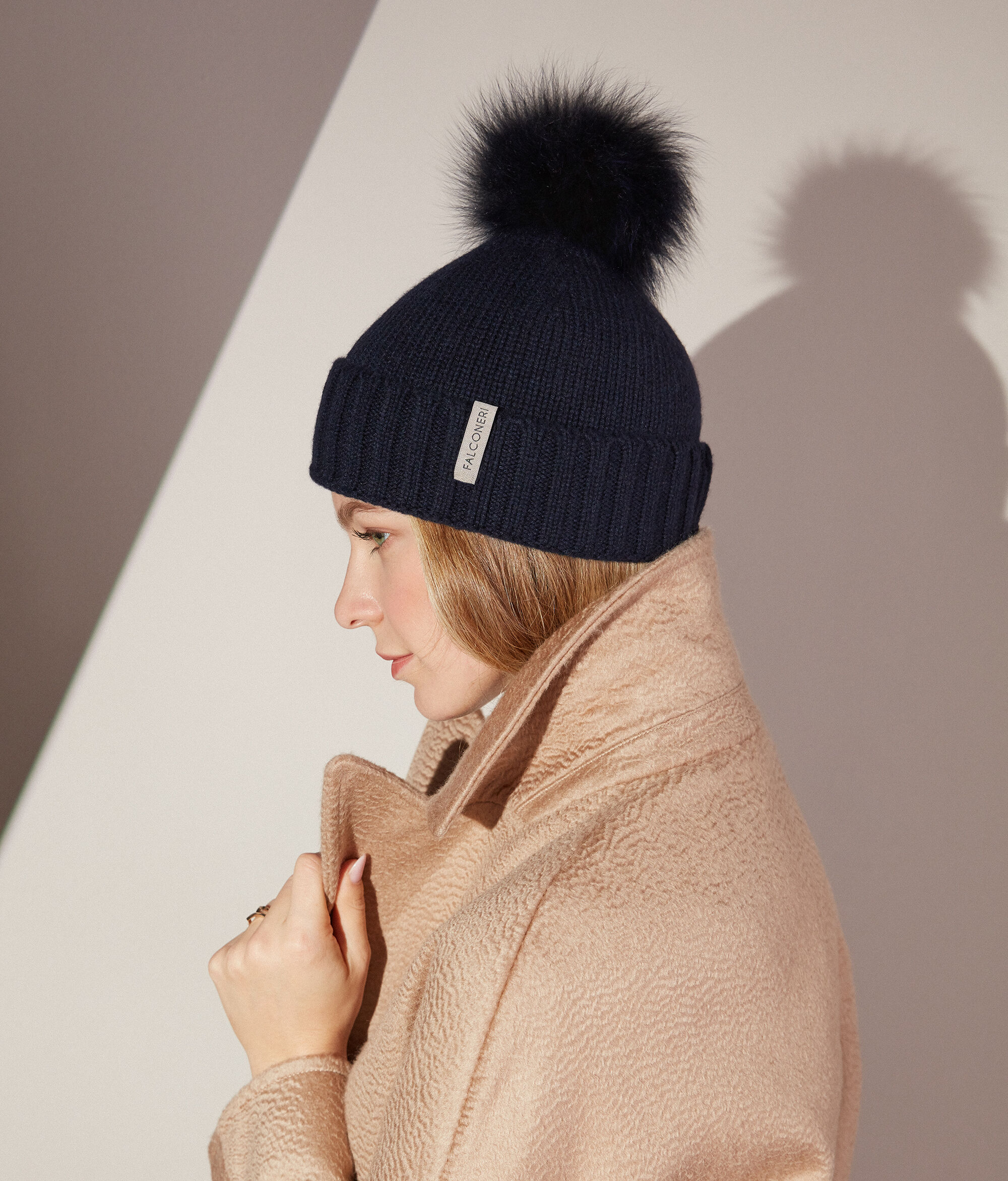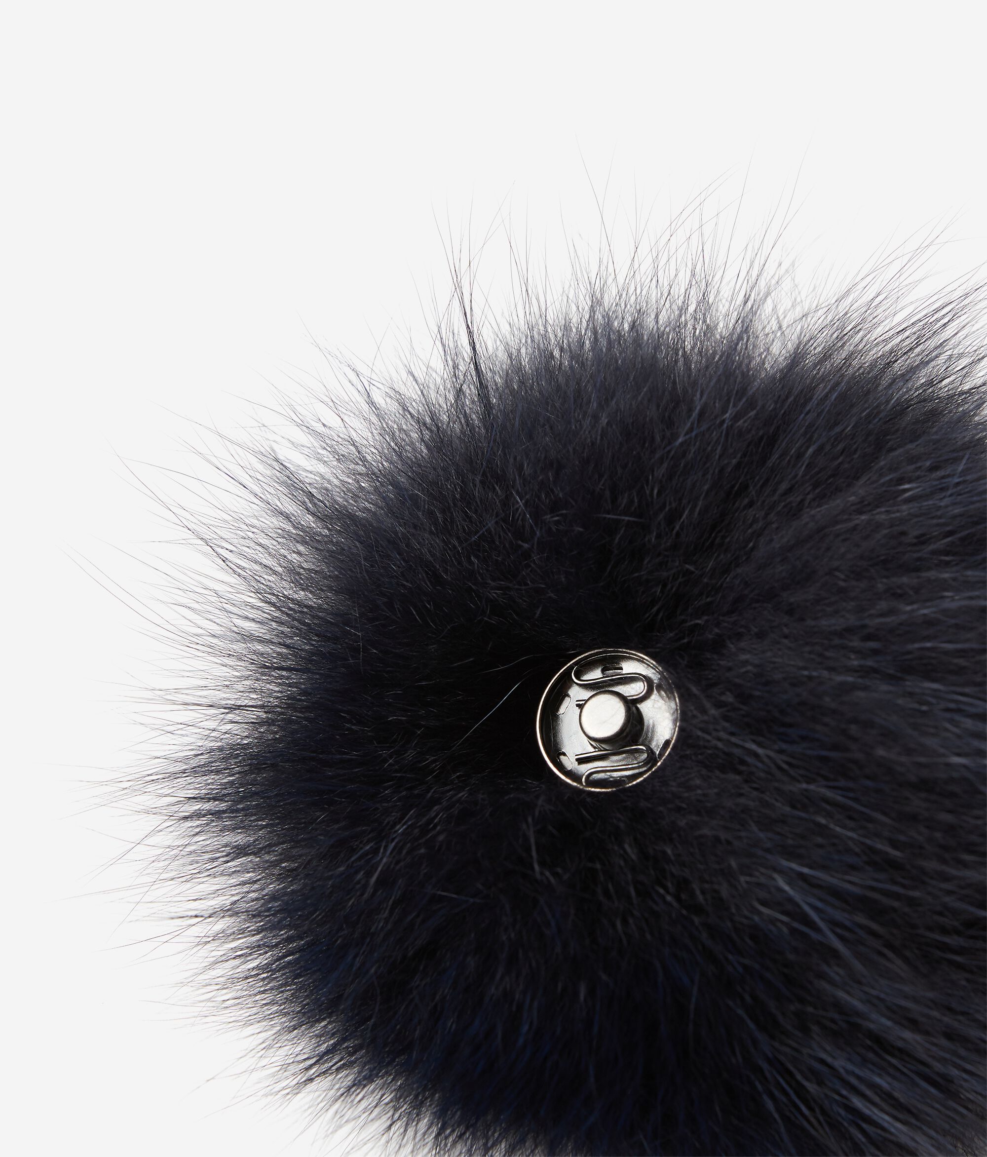 An elegant pompom in real fox fur enhances simple knit caps this winter.
