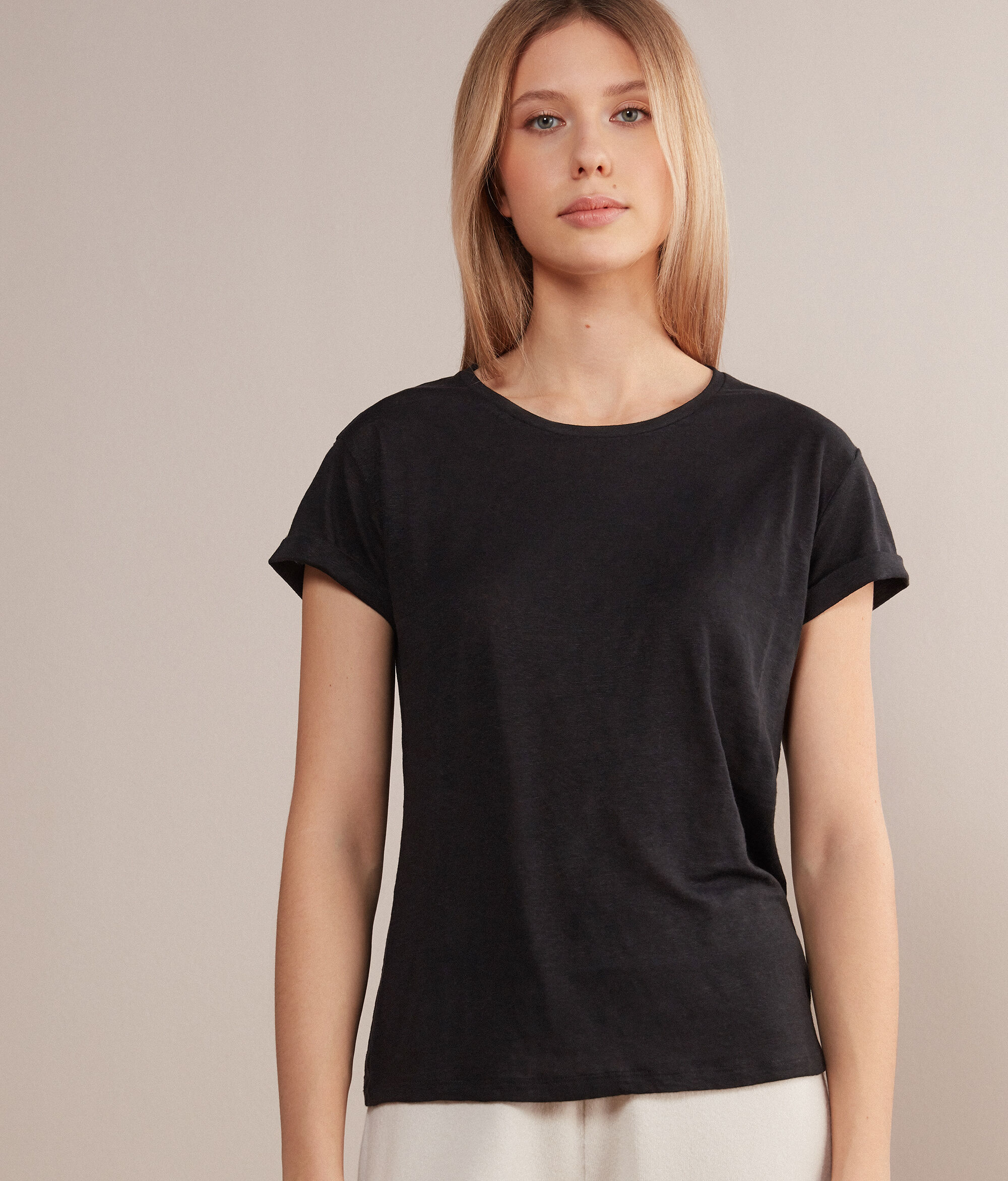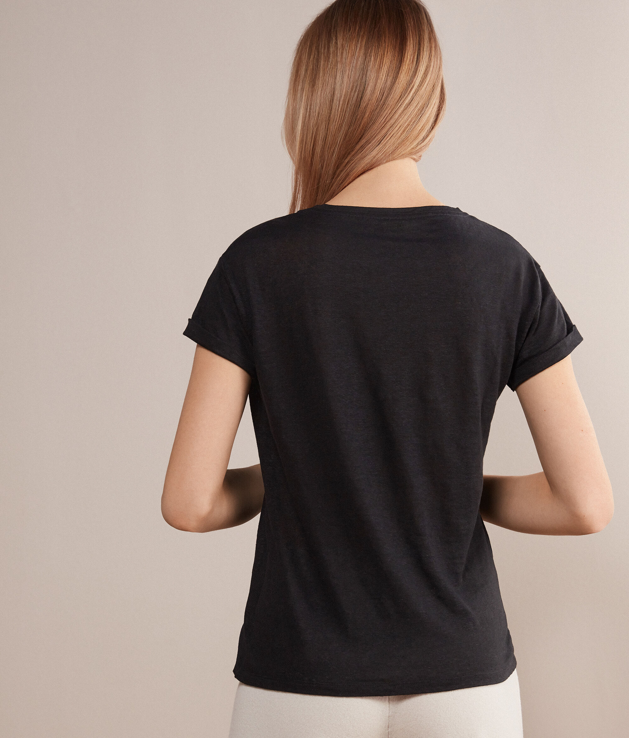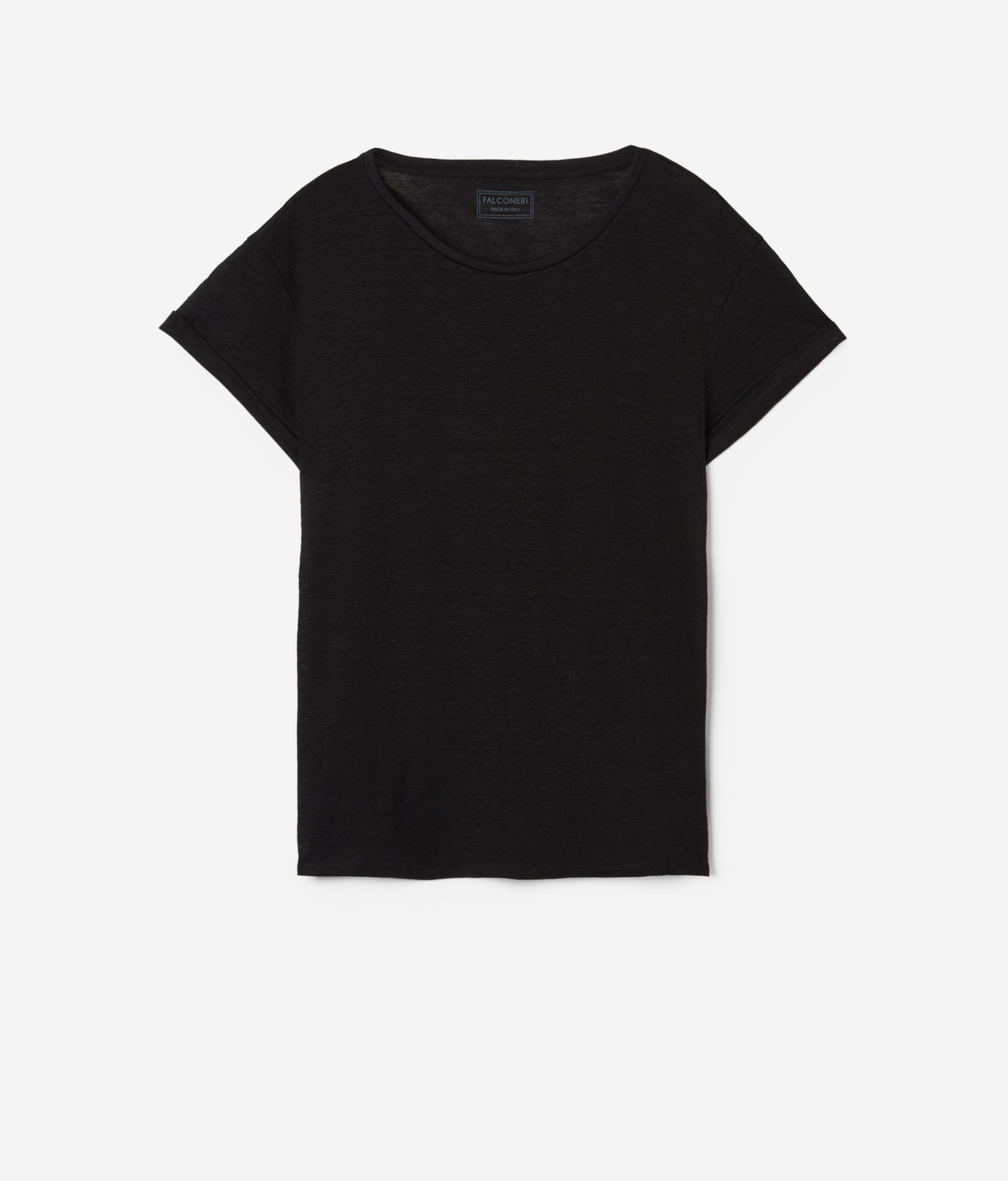 FALCONERI filati naturali. Linen crew neck T-shirt. Regular fit. Model is 5'8 and wears size M Chest: 34.32" / Waist: 26.13" / Hips: 36.66"